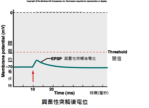 根據突觸後神經元的膜發生去極化(depolarization)或過極化(hyperpolarization),可將突觸後電位分為興奮性突觸後電位(excitatory postsynaptic potential;EPSP)和抑制性突觸後電位(inhibitory postsynaptic potential;IPSP)兩種。