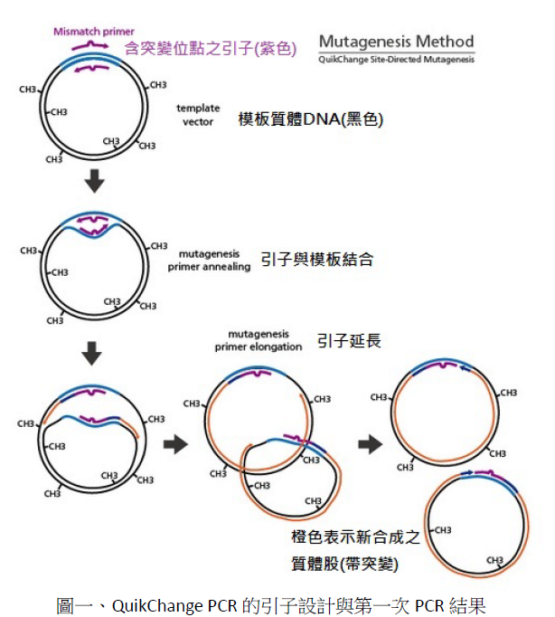 1.首先,設計一對25~45鹼基對的引子,將欲突變之位點盡可能地置於正中央,在引子的兩端最好是G或是C以加強引子配對的正確性。以此引子對與模板質體進行兩次PCR反應之後得到如圖二的不同序列組合質體。其中新的DNA序列不是在細菌體內合成,因此不具有甲基修飾;而原來做為模板的質體,因為是由細菌體內得到,故其序列含有甲基修飾。